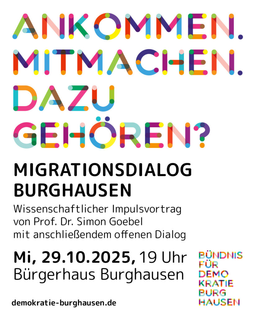 Am 29. Oktober um 19 Uhr lädt das Bündnis für Demokratie Burghausen zum Migrationsdialog ins Bürgerhaus ein. Mit Impulsvortrag von Prof. Dr. Simon Goebel, einer offenen Podiumsdiskussion mit Gästen aus Wirtschaft und Handwerk, Ehrenamt, Pädagogik und Jugendarbeit – und Videostatements von Migrant*innen aus Burghausen.
